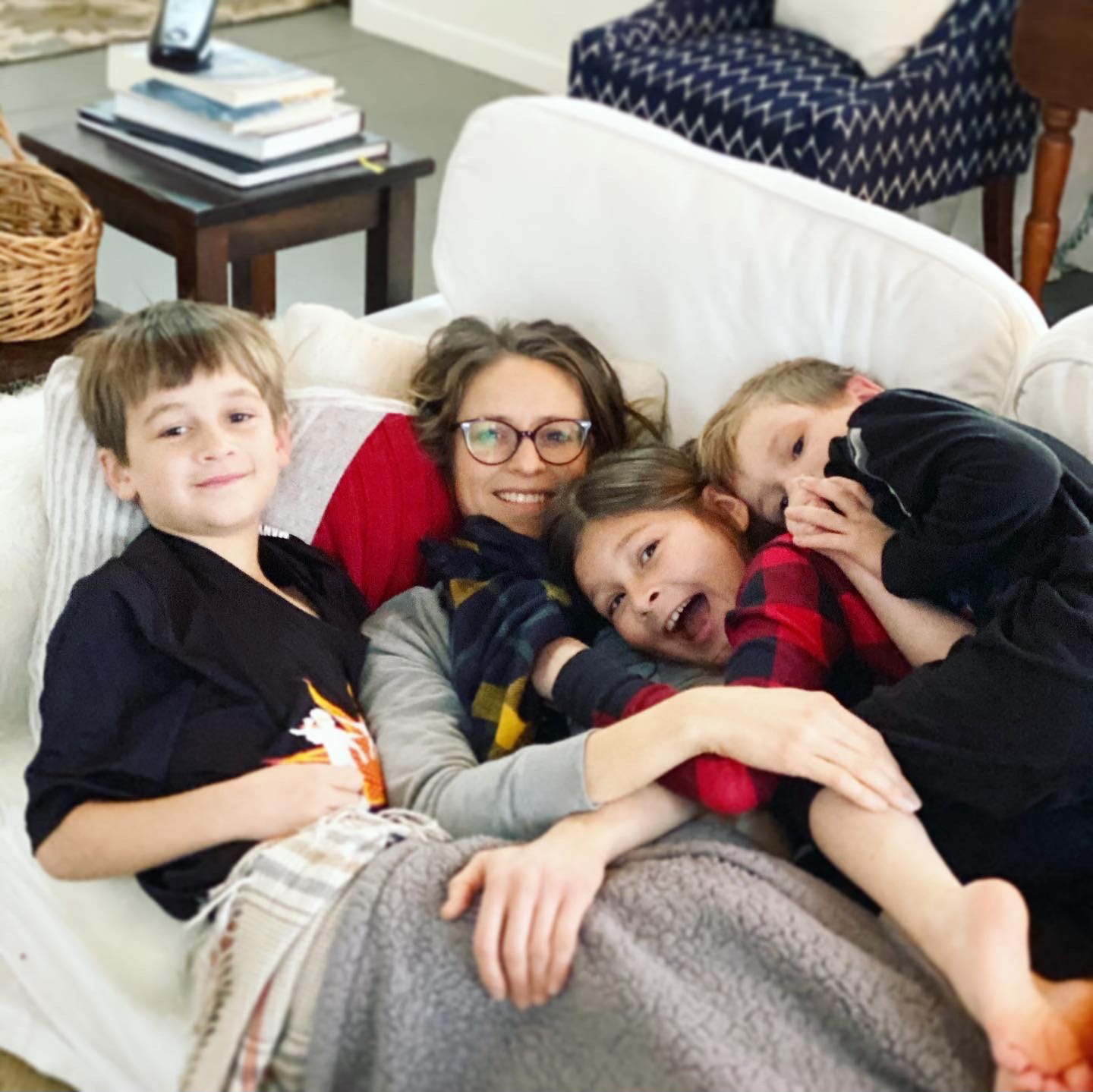 But I sit and watch because this is what the family wanted and I am trying very hard to sit still and be present. Something I am not very good at. I’m wedged in on either side by my boys, piled on top of me. My husband, who’s sunk into the other side of the couch, adores me. Therefore my kids adore me. It’s wonderful. Except for when I don’t want to be touched, which is often. I feel bad that I am like this, which is why I’m trying to enjoy this pile-on. My daughter calls from the chair across the living room that she feels left out, that our couch isn’t big enough. As if to prove her point she comes over, plops herself on the arm rest next to me and slides down into a non-existent spot, squeezing her brothers closer. We’re sardines. All five of us on the couch.